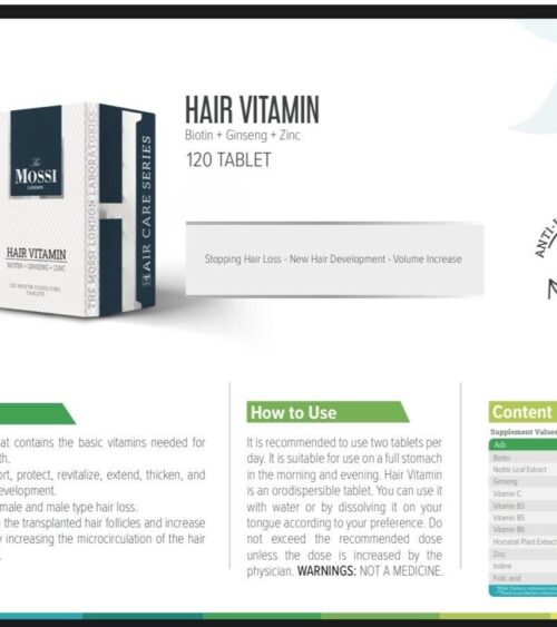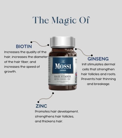 Mossi hårvitamin er et supplement, der indeholder vitaminer, der er nødvendige for hovedbunden. Dette vitamin hjælper med udviklingen af hårsækkene, beskytter, revitaliserer og fortykker dem. Det fortykker også hårsækkene og forhindrer hårtab. Takket være Mossi hårvitamin bliver dit hår tykkere og lader håret vokse igen fra de tabte steder.