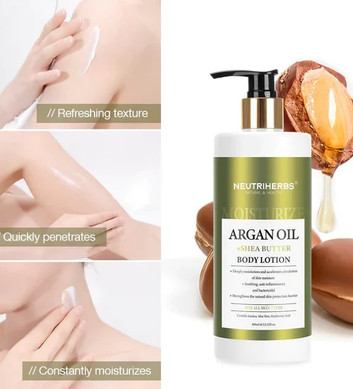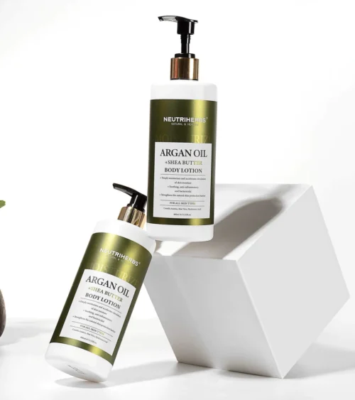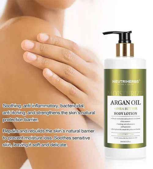 Neutriherbs Argan Oil bodylotion er beriget med Argan Oil og Shea Butter. Oprindende fra Marokko, genopbyggende Argan Oil fugtighedscreme er kendt som “flydende guld” for dets helbredende og beroligende egenskaber. Sheasmør og Centella Asiatica kan blødgøre, regulere og fugte huden, samtidig med at de bekæmper inflammation. Denne lotion er let, men effektiv hudpleje, der giver intens hydrering for at bibeholde en visuelt blødere, glattere og mere smidig hud, samtidig med at den reducerer udseendet af rynker, fine linjer og pletter. Det kan let absorberes uden en fedtet rest. Udviklet til alle hudtyper.