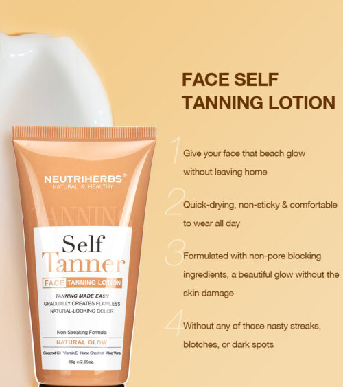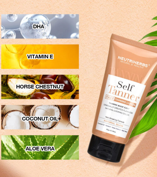Neutriherbs gradvist selvbruner lotion giver dit ansigt den strandglød uden at skulle forlade dit hjem. Vores veganske, grusomhedsfri og naturlige formel giver dig mulighed for at opbygge din brunfarve et lag ad gangen for at få dit ideelle niveau af bronze uden nogen af disse grimme striber, pletter eller mørke pletter. I mellemtiden vil kokosolie, E-vitamin og Aloe Vera tilføre din hud fugt, styrke hudbarrieren, forbedre glans, elasticitet og ungdommelig glød til huden.