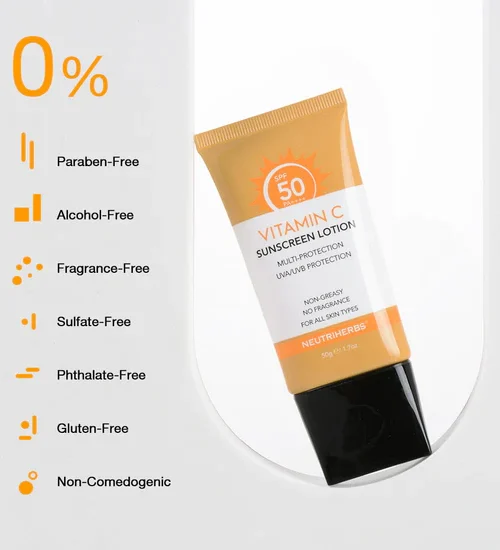 Neutriherbs C-vitamin solcreme SPF50 giver effektiv beskyttelse og mod UVA- og UVB-stråler, der fortsætter klart og uden at efterlade en fedtet fornemmelse på huden. Denne C-vitamin solcreme SPF50 glatte formel indeholder Panthenol til at fugte, mens E-vitamin og C-vitamin, som hjælper med antioxidanter og anti sløvhed, kan det lysne din hud op for en mere lysende teint. Den ikke-fedtede, parfumefri, alkoholfri formel er velegnet til alle hudtyper.