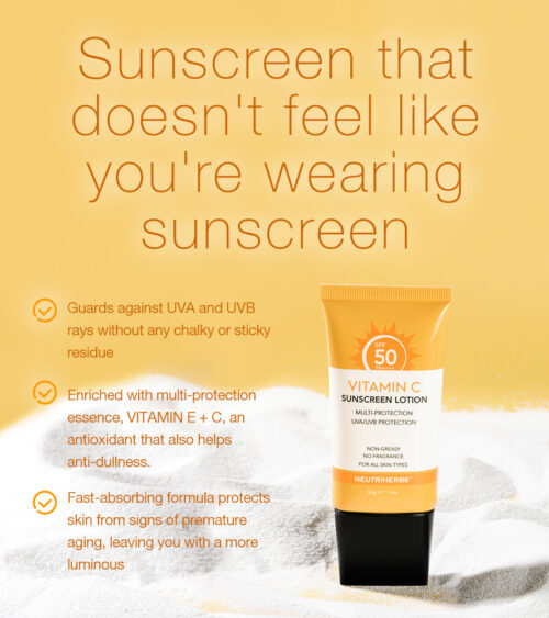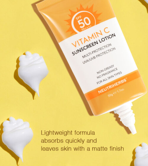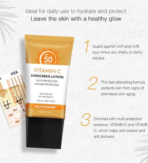 Neutriherbs Vitamin C Solcreme er beriget med multibeskyttelsesessens, E-VITAMIN og C-VITAMIN, en antioxidant, der også hjælper mod sløvhed. C-vitamin solcreme beskytter mod UVA- og UVB-stråler uden kalkholdige eller klæbrige rester. Desuden beskytter denne hurtigabsorberende formel huden mod tegn på for tidlig ældning, og efterlader dig med en mere lysende, yngre og sundere teint. Ideel til daglig brug for at fugte og beskytte og efterlade huden med en sund glød.