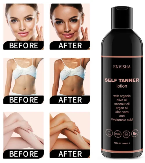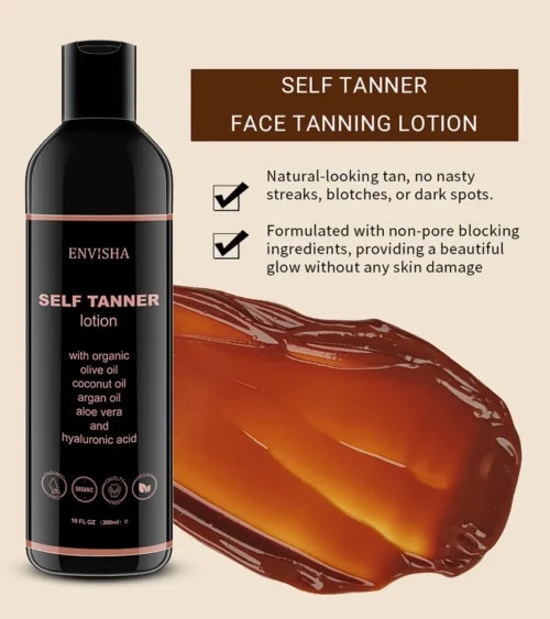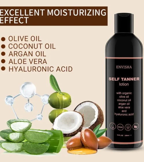 Vores selvbrunende lotion er beriget med hudvenlige ingredienser som aloe vera, oliveolie, kokosolie, arganolie og hyaluronic acid til at fugte og hydrere din hud, samtidig med at den leverer en smuk tan. Dens hurtigtørrende og ikke-fedtede formel gør den let at påføre og bære i løbet af dagen eller natten.